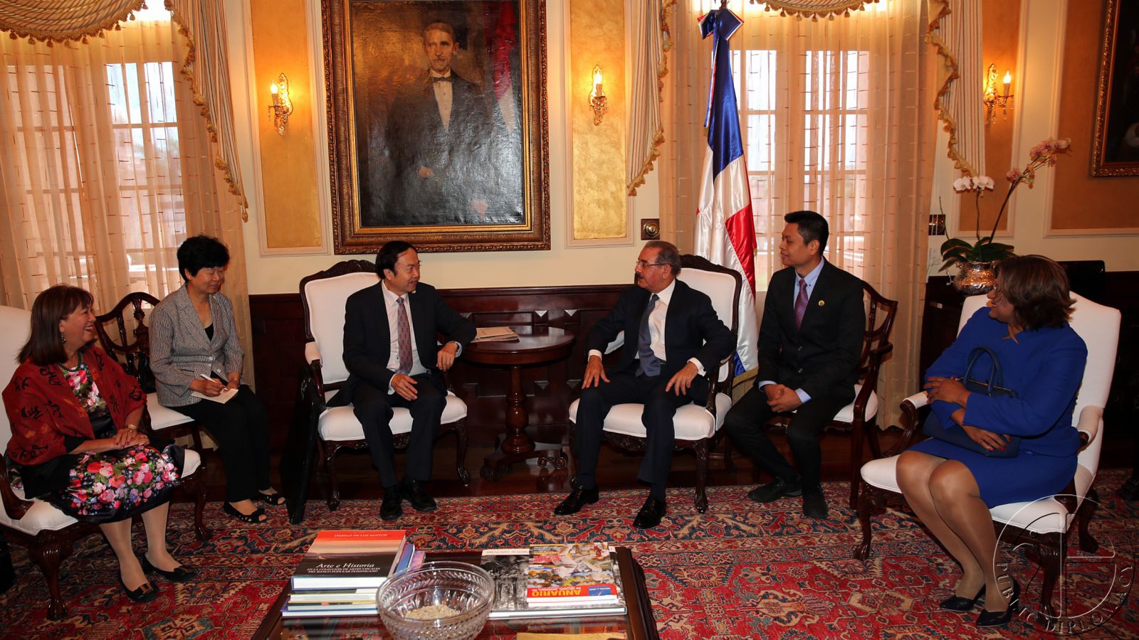 多米尼加总统达尼洛·梅迪纳.桑切斯(右三)、袁熙坤(左三)、多米尼加外交部副部长内丽.佩雷丝(右一)、多米尼加驻中国贸易发展办事处代表吴玫瑰(左一)等人在总统府