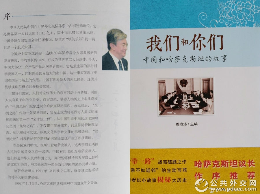 2014年,编撰《我们和你们:中国和哈萨克斯坦的故事》一书时,我致函托卡耶夫议长,请老朋友拨冗为该文集作序。他很快就回复同意,并撰写了长达6页、内涵丰富的序言。其中指出:历史上的丝绸之路作为一条贸易通道,实际上成为将东西方人类文明连接起来的第一个全球性工程。习近平主席访问哈薩克斯坦时提出的丝绸之路经济带倡议十分重要,具有战略意义。哈中两国在短短的历史时期内建立起了国家间关系的典范,我们对两国人民间关系的未来充满信心。中国前驻哈萨克斯坦大使是我的朋友,为发展两国友好合作做出了重要贡献,哈萨克斯坦为此真诚地感谢他们。本书是我们两国人民之间友谊的鲜明体现。