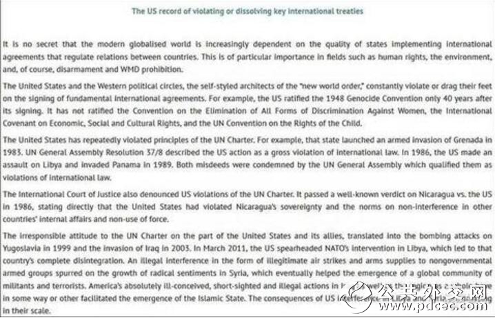 扎哈罗娃还总结,“这个单子还没完。美国顾及其现有的政治环境、以及自身利益,正在玩弄这些文件(条约)。因此,当美国说他们要退出条约,只是因为俄罗斯没有遵守承诺的时候,这不是真的。这样的借口不管用。”