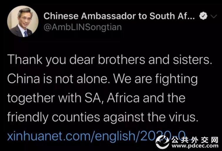 中国驻南非大使林松添转发了媒体对阿乐的报道并刊文称:“谢谢兄弟姐妹们,中国并不孤单。我们正与南非、非洲以及其他各友善国家一起抗击病毒。