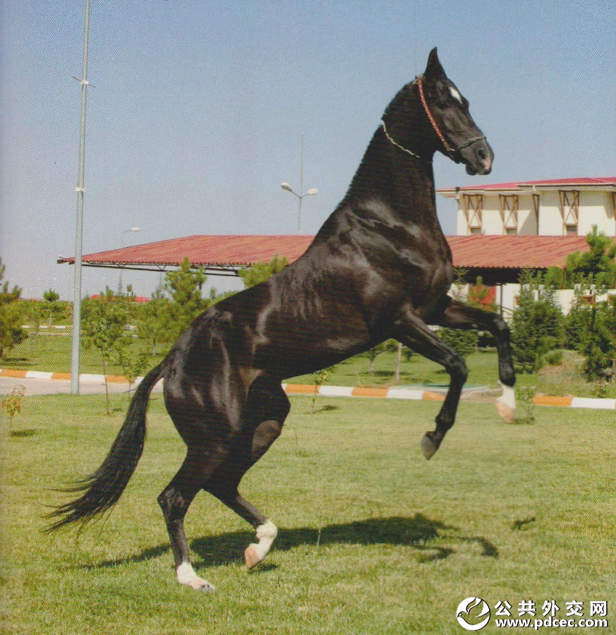 2006年,土库曼斯坦总统访华时向中国领导人赠送第二匹阿哈尔捷金马。这匹马2001年出生,名叫“阿尔喀达葛”,意为“靠山”。体形修长,高1.61米,长1.62米。身上毛色纯黑,三腿雪白,额头正中有一块棱型的白色花纹,长得很帅气。土库曼人认为,三腿白色的马为好马。其战绩辉煌:2岁时平地1000米速度纪录达到1分06秒,曾在全国速度赛中6次荣获冠军。经过精心培育,该马从青年健康地步入壮年,生育性能强,遗传性稳定。