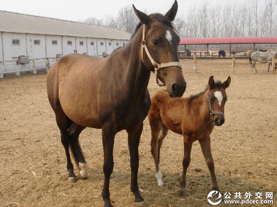 2013年初,当得知安置在武清汗血马中心的阿哈尔捷金马已成功配妊,即将有纯种小马降生时,我心中萌生出一个念头——为什么不去亲自探访一下近在咫尺的神奇宝马呢?在春暖花开之际,我和夫人专程从北京来到天津武清。汗血马中心负责人一听是外交部客人,而且有宝马情结,十分热情地接待了我们,并详细介绍了相关情况。该中心占地近2000亩,基础设施齐全,具有高级兽医师、畜牧师、调训师等专业人才,还有马医院。为了驯养好宝马,繁育中心配备专业团队负责照料,拥有专用马厩舍、马房和训练活动场所。土库曼斯坦驻华大使来参观后,对这儿的环境和条件感到满意。为使汗血马能在国内繁衍纯种,2011年公司从国外引进13匹纯种母马。除2匹年龄还小,可配种的11匹中10匹均已怀孕。就在不久前,4匹小马驹已顺利降生,最小的才一个星期,还带着一身胎毛,十分淘气。母马怀胎期为11个月,小宝宝生下4个小时后就能自己站立起来。