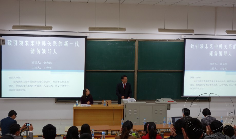 金光洙议长同时表示,要培养世界性的领导人,不仅要重视国内人才交往,更要与海外建立人员交流网络;对韩国年轻人来说,学习中国古典文化可以得到内在力量,对自己的人生是有益的营养。“学而不思则罔,思而不学则殆。”金议长充分引经据典,鼓励在场学生像松柏一样不屈服任何困境与苦难,以“力拔山兮气盖世”的气概投入到追逐梦想的实践中,实现自己的人生抱负而后为人类和平的梦想而奋斗,为增进中韩两国友谊和信任贡献智慧,成为中韩友好交流的桥梁。