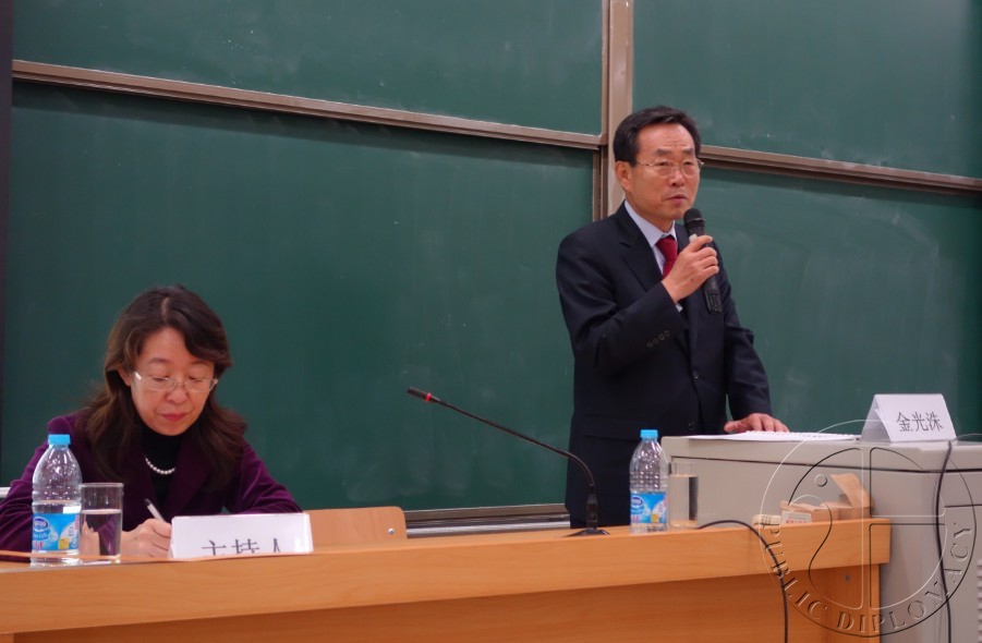 【公共外交网讯】10月30日下午,韩国忠清北道议会议长金光洙做客外交学院,为中韩学生做了题为《致引领未来中韩关系的新一代储备领导人》的演讲。其间金光洙议长频频引用中国古籍经典,博得满堂彩;他对中韩关系史的梳理式回顾,及对中国青年的殷切希望,也赢得了在场师生的钦佩和积极回应。