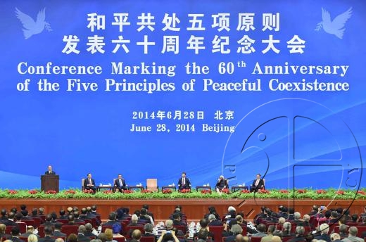 和平共处五项原则发表60周年纪念大会6月28日在人民大会堂隆重举行。下午5时10分,习近平、李克强、张德江、俞正声等党和国家领导人与缅甸总统吴登盛、印度副总统安萨里一同步入会场。在热烈的掌声中,国家主席习近平发表题为《弘扬和平共处五项原则 建设合作共赢美好世界》的主旨讲话。国务院总理李克强主持大会。