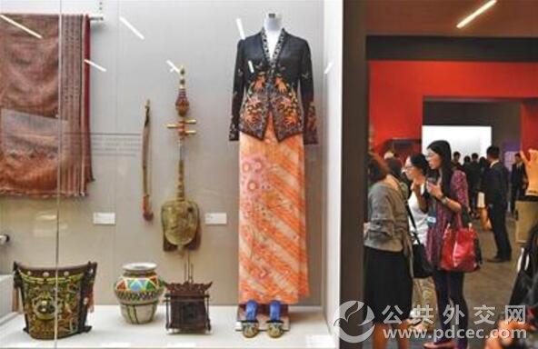 展览中还有一些现当代展品,展示了地区独特文化。一件来自马来西亚的娘惹服(可芭雅服),展示了这种土生华人(峇峇娘惹)所穿的服饰,通常绣有金鱼、海浪和玫瑰花图案,能凸显年轻人身材,故年轻人常穿着此类服装。缅甸则带来了一件当代竖琴,竖琴被称为弦乐器之王,曾在缅甸骠国时代(公元前2世纪-公元10世纪)被广泛使用。
