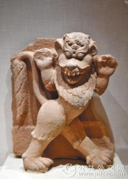来自新加坡亚洲文明博物馆展品,公元10世纪的砂岩浮雕狮子建筑构件。