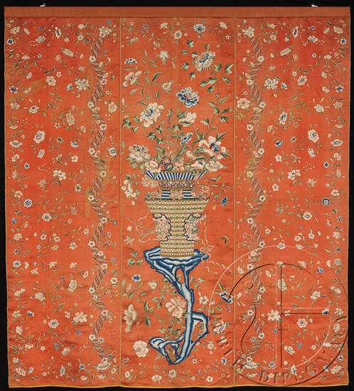 18世纪中国的双面挂帘技艺同样深深吸引了西方贵族。本次展出的一件挂帘上,一面是深黄色,另一面是红色。其主题是一束鲜花,它与典型的中国式花卉不同,其中心突出,与花瓣对比显著,印度的出口纺织品也具有类似的植物形式。其花瓶放置在一块典型的中国式假山石上。两边的刺绣各不相同,却都精彩非凡。根据标签介绍,这是一件床上的挂帘,床上的人看到的是红色的那边,而床下的人看到的是黄色那边。
