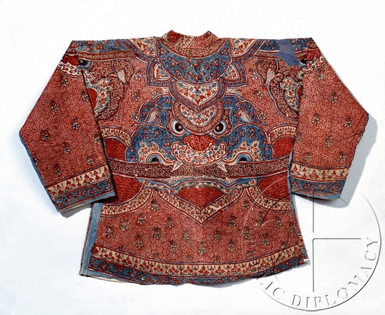 在当时的印度,纺织品出口作坊蓬勃发展,不仅仅销往欧洲和美洲,同样接受来自印尼、日本、泰国、斯里兰卡等地的订单。展览中有一件18世纪的棉夹克,是为泰国国王的皇家卫队制作的,其背面是一张奇形怪状的恶魔的脸。