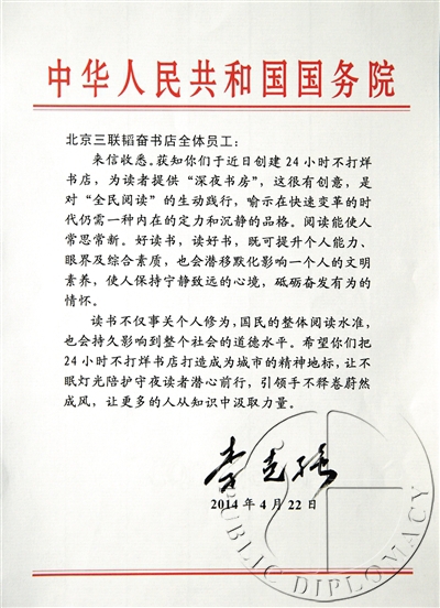 2014年世界读书日前夕,国务院总理李克强给北京三联韬奋书店全体员工回信,肯定创建24小时不打烊书店这一创意,指出这是对“全民阅读”活动的生动践行,希望三联韬奋书店把24小时不打烊书店打造成为城市的精神地标,让不眠灯光引领手不释卷蔚然成风。李克强表示,阅读能使人常思常新。
