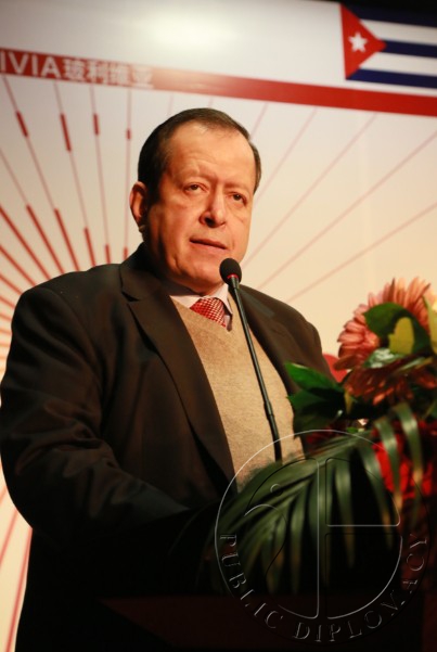左起为:玻利维亚驻华大使吉列尔莫·查卢普·连多、古巴驻华大使白诗德、