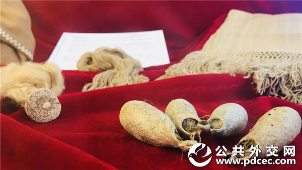 如图可以看到蚕茧,纺线的纺锤以及最后制成的织物