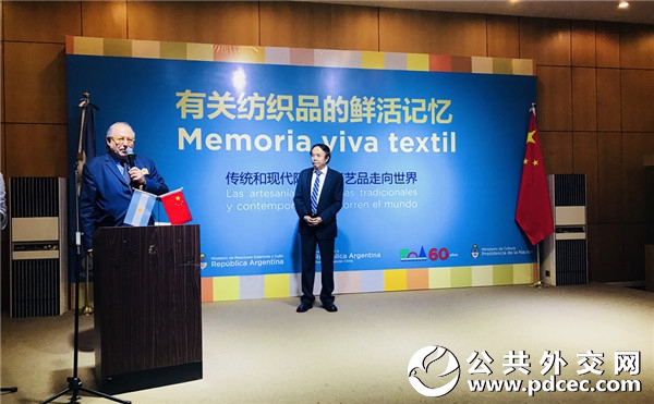 【公共外交网讯】2018年6月19日,由阿根廷国家艺术基金和阿根廷外交部共同组织的纺织品工艺品巡回展在北京金台艺术馆举办。阿根廷驻华大使盖铁戈、金台艺术馆馆长袁熙坤到场祝贺。