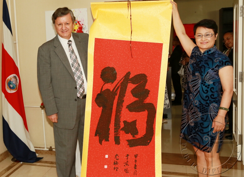GBD公共外交文化交流中心副会长曲真女士代表中心,向马尔科•鲁伊斯大使赠送由中国著名书法家书写的”福“字作为礼物,寓意为祝福他和哥斯达黎加的人民幸福安康。马尔科•鲁伊斯大使愉快地收下礼物,表示这份礼物很有意义,会好好收藏。