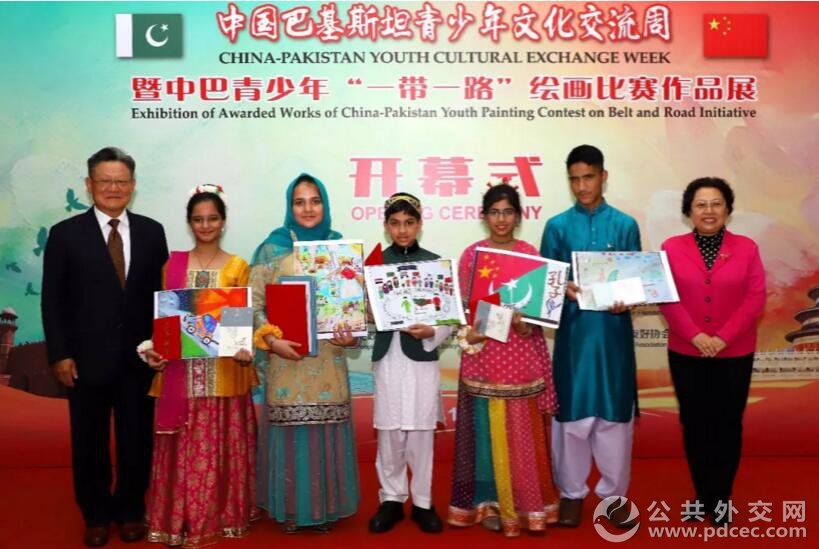 北京市副市长王红、中巴友协会长沙祖康、巴基斯坦驻华大使纳格玛纳·哈什米、全国对外友协副会长林怡为中巴青少年“一带一路”绘画比赛的两国获奖学生颁奖。