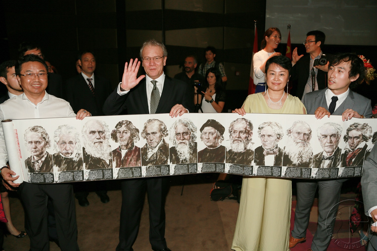 在宴会致辞之后,伴着优美的音乐,古铁雷斯大使接受在场嘉宾对他的祝福。作为临别纪念,公共外交文化交流中心赠予古铁雷斯大使著名肖像画大师于成松的《中外名人肖像》 作品,他接受礼物时开心地向公共外交网记者表示,非常感谢中心为增进秘中友好关系所做的贡献,他曾参与过中心许多活动,中心美丽的装潢和可爱、辛勤的工作人员给他留下了深刻的印象。(文/公共外交网 王祎)