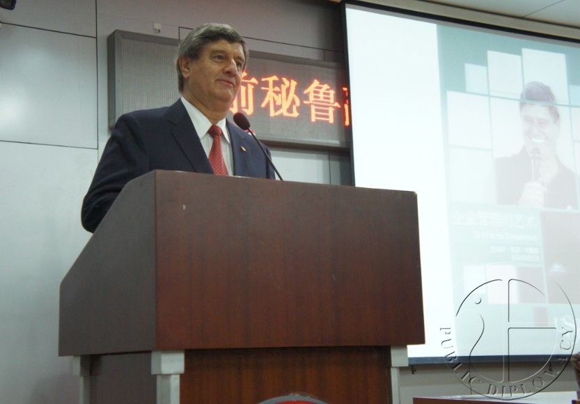 谈及成功经历与世界形势,劳尔·迭斯·坎塞科表示,虽然全球经济还未从危机中完全恢复,但对于秘鲁和中国等新兴经济体来说,危机中潜伏着机遇和崛起的希望。而对于全世界的年轻人来说,成功不但取决于社会政策与环境,更由个人的能力和努力决定。同时坎塞科先生还引用中国古谚语“授人以鱼不如授人以渔”来表示,成功的核心在于知识,而教育是一生的事业;他亲切地鼓励在场的中秘青年将眼光放长远,明确自己的人生目标并且不要畏惧做出选择。无论是继续深造还是工作创业,都不能放弃学习,只要善于发挥洞察力、想象力与创造力,并具备毅力和韧性,成功是不分国别与地区的。坎塞科先生一席诚恳而富有激情的讲话博得了现场学生的热烈掌声。