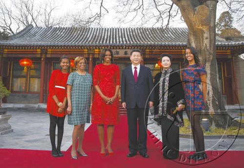 昨天,走进钓鱼台国宾馆的米歇尔穿了一身“中国红”连衣裙,脚蹬同样颜色的高跟鞋,小女儿萨沙也穿着红色连衣裙,系白色腰带,大女儿玛利亚也穿着蓝底红花的花裙子,米歇尔的母亲鲁滨逊夫人选择了一条朴素的蓝色花纹连衣裙。