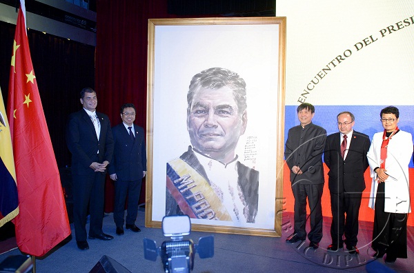 厄瓜多尔共和国总统拉斐尔·科雷亚·德尔加多(左一)、公共外交文化交流中心执行会长马振轩(左二)、厄瓜多尔驻华大使何塞·博尔哈(右二)、公共外交文化交流中心副会长曲真总(右一)、中心画家于成松(右三)共同为总统的巨幅肖像画揭幕