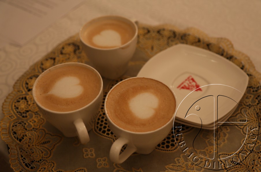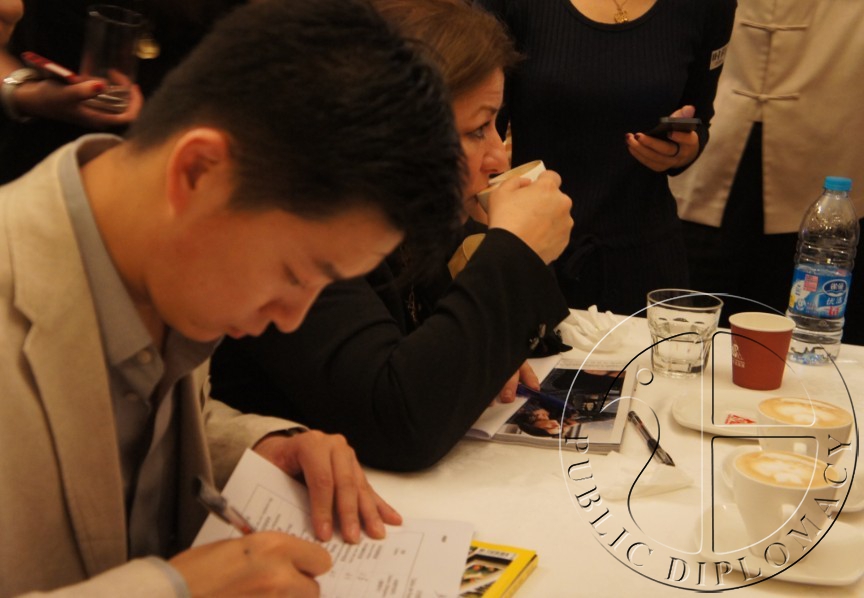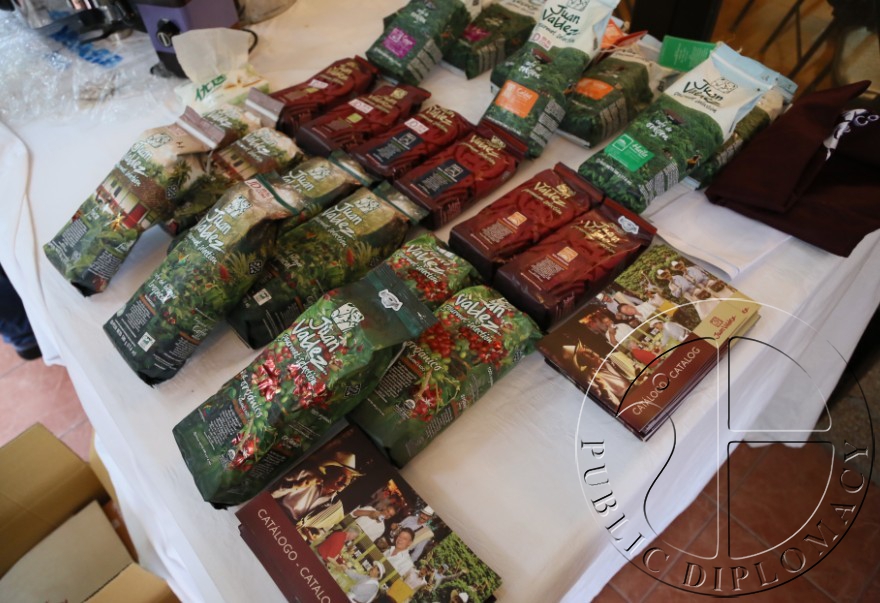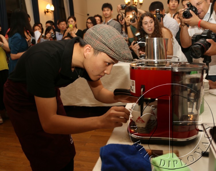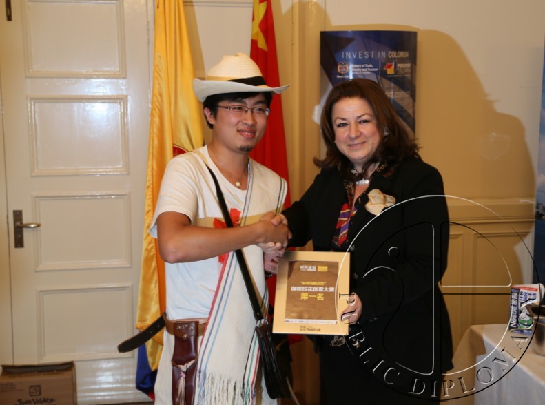 哥伦比亚驻华大使卡尔门萨·哈拉米略为咖啡拉花大赛冠军颁奖