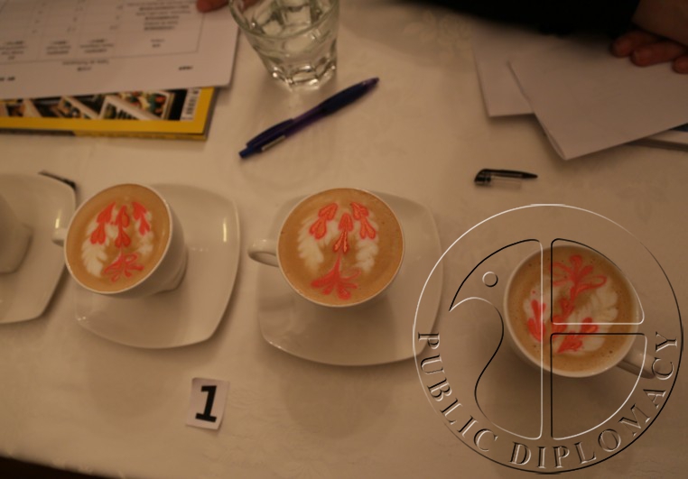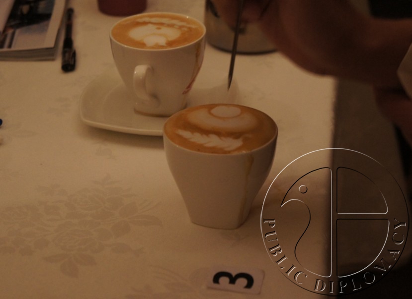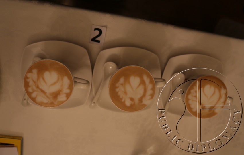 评委认真观察咖啡拉花的形状、大小、融合度并打分