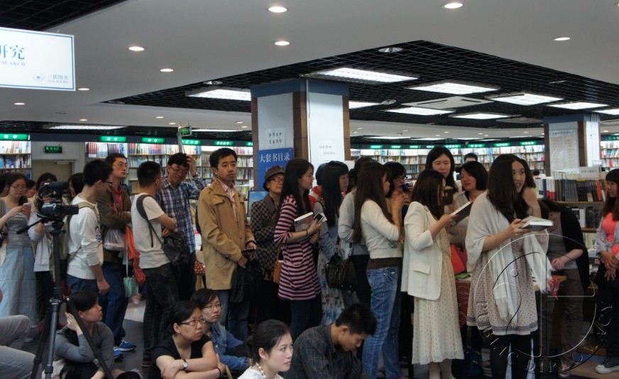 六十岁开外的李润清是第一个上台诵读的中国读者。她将灰白的长发绾在脑后,老花镜架在额头上,特意把书拿远了些看。尽管面对着众多的听众,尽管读得略显生涩,李老还是从容地读完了将近一页的长度。她告诉记者,自己此前没有阅读过马尔克斯的作品,在《北京晚报》上看到活动预告后专门赶来参加。“我家在首图附近,回去后就把这本书借出来看。这么有名的书,应该读一读。”次日(27日)早晨7点不到,她又来到三联书店,排号准备再读一段。