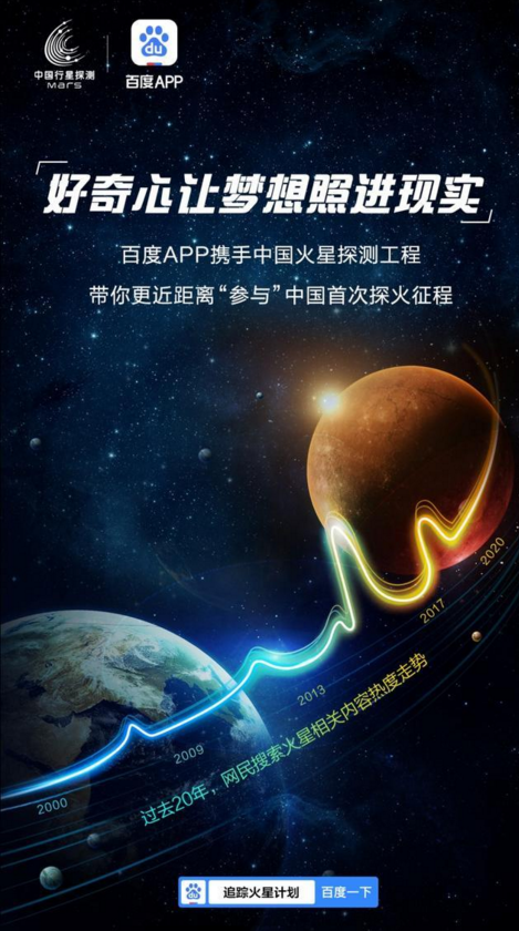 2020年是中国探测火星元年,国内民众对火星的关注度急剧上升,追踪报道火星探测任务“天问一号”,将在多个方面聚拢民众对火星的求知热情。百度将邀请有关中国航天专家、火星知识大咖等,组建史上最强火星探测知识天团,通过火星探测知识科普直播等方式,增进人们对中国火星探测工程的指导思想、重大意义、工程目标、科学目标和系统构成的理解,为网民好奇心解密。
