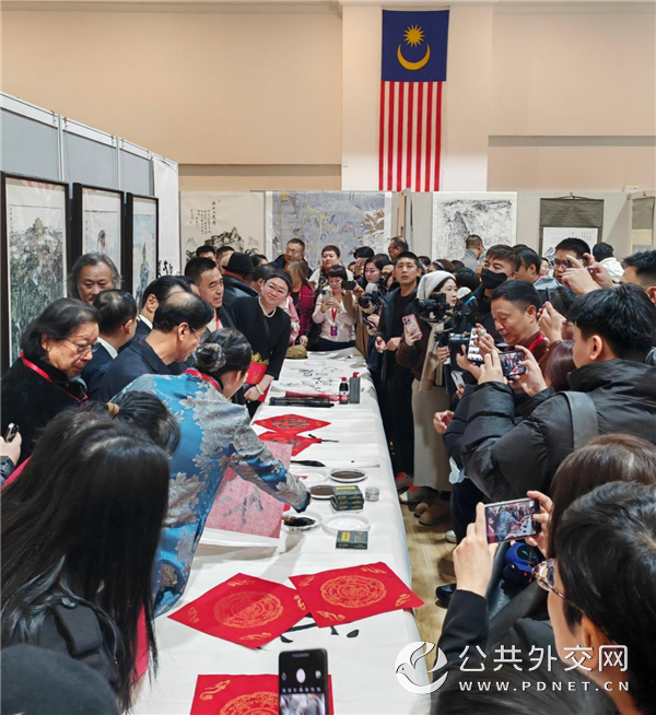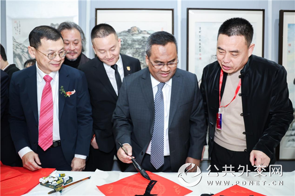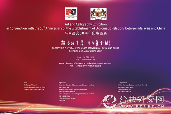 【公共外交网讯】2024年12月10日,为庆祝中国和马来西亚建交50周年,一场意义非凡的艺术交流展在马来西亚驻华使馆璀璨启幕,成为两国文化交流盛事。本次展览由马来西亚驻华使馆主办,中国马来西亚商会、中国马来西文化艺术协会、中国书画收藏家协会、公共外交网联合承办,北京甜苑文化传媒有限公司、北京法雨文化有限公司协办。马来西亚驻华大使拿督诺曼·穆罕默德、喀麦隆驻华大使、使团团长马丁·姆帕纳、文莱驻华大使佩欣·拿督·拉赫马尼·拿督·巴西尔、日本驻华大使金杉宪治等驻华使节,以及中国马来西亚商会会长罗维坚、中国书画收藏家协会会长张德俊等嘉宾出席活动。中国美术家协会副主席祁海峰特为画展题字。