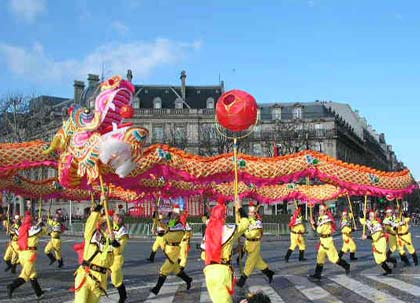 大年初二,庆新春系列活动在巴黎三区区长爱登堡、中国驻法大使蔡方柏和杨明的主持下正式开始。新春游行开始后,许多法国人闻讯从很远的地方赶来,与中国人一道涌向街头,目睹这一盛大活动。旅法华侨俱乐部的游行队伍由18个方阵组成。在喜庆的锣鼓声中,五头醒狮欢腾起舞。巴黎还派出了警察来维持秩序。法国人真正看到了中国人的精神。系列活动持续了一周,从有关中国人在法百年历史讲座到区政府图书馆的中国文学介绍,从中国水饺到中国灯笼的制作,从中国传统音乐、舞蹈、戏曲的演出,到中国题材的摄影展览、中国电影的放映……多样的展示活动使法国人更加了解了中国,中国的“巨龙”腾跃在巴黎古老的街头。这是法国人第一次看到中国迎接春天迎接新年的庆祝盛会。