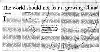 2013年9月9日,国务院总理李克强在英国《金融时报》发表署名文章《中国将给世界传递持续发展的讯息》。