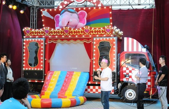 大篷车刚刚到达龙门乡隆兴村就吸引了众多的小朋友,他们一个个好奇地围着大篷车,兴奋的和身边的小伙伴猜想着大篷车变身后的样子,还不时追着站点的工作人员询问,甚至到了晚饭时间还有一些孩子不舍得回家吃饭。晚上的活动将隆兴村几乎全部的儿童和村民吸引了过来,现场热闹非凡。“映像大篷车”一直是孩子们关注的焦点,他们翘首期盼着大篷车的变身。经过工作人员十几分钟的努力,车厢侧壁慢慢打开变成可打开的侧门,放映幕布呈现眼前,粉红大象和游戏气垫分别从大篷车车顶和侧厢冲出,车身灯光亮起,仿佛一个小型的梦幻城。所有孩子们都为大篷车童话般的变身兴奋不已,他们欢呼着跑到游戏气垫上玩耍,兴奋的拉着同伴、家长和大篷车以及粉红大象合影拍照。
