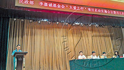 李嘉诚基金会资助2000万元人民币与民政部合推的“大爱之行--全国贫困人群社工服务及能力建设项目”近日在青岛举行启动实施会议。民政部社会工作司司长王金华和李嘉诚基金会高级项目经理罗慧芳等出席会议。王金华指出,大爱之行项目将推动改善受助人群的生活境遇,推动社会工作专业人才与民办社工服务机构能力建设,建构社会工作服务标准体系,探索社会工作服务新模式。