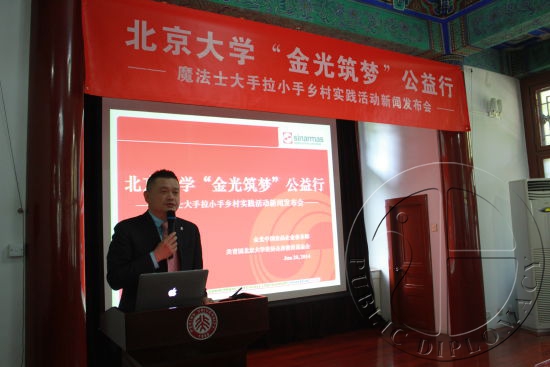 据金光中国食品企业事务副总裁黄品洁先生介绍,金光中国食品特别关注以学生为主的青少年群体们的健康成长。金光集团董事局主席黄荣年先生自2006年起就在北京大学设立黄奕聪伉俪奖助学金,多年来帮助了许多积极努力的贫寒学子,激励他们奋发向上共筑中国梦。此次和北京大学教育基金会扩大合作,成立“金光筑梦基金”,并以专款支持由共青团北京大学委员会主办2014年学生暑期社会实践活动之“魔法士大手拉小手乡村公益行”的专项活动,旨在启发与鼓励在校学子把握时代脉搏、聚焦社会发展、投身实践行列,并且提倡“大手拉小手”的理念,希望北大学子学业有成之后不要忘记生育养育自己的故乡,要把更大的热情和精力回报自己的故乡和社会。