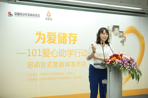 7月30日,中国青少年发展基金会(以下简称中国青基会)与余额宝在北京举行“为爱储存——101爱心助学活动”启动仪式暨新闻发布会。中国青基会副理事长、秘书长涂猛,余额宝运营总监胡乐天等出席了启动仪式。