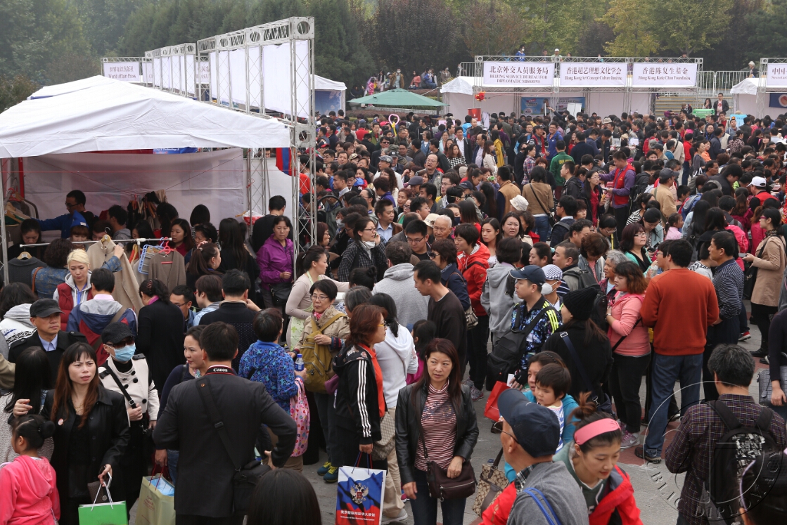 义卖活动于19日10点向公众开放。尽管当天雾霾严重,天气微凉,但这些都没有阻挡人们的热情。记者九点来到在朝阳公园,售票厅前已排成“九曲回环”,不少排队等候的人更是全家出动。据记者了解,因为国际义卖活动能使人们在短时间内集中领略各国风情,又能奉献爱心,加之之前几次义卖活动的成功举办,所以很多人都乐意起早排队等候。