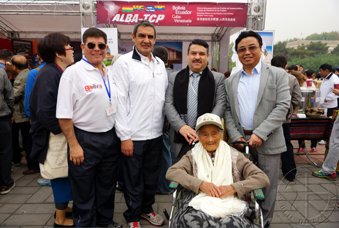 马会长(后排右一)携母亲(前排右一)与玻利维亚驻华大使(后排右二)、公使(后排右三)亲切合影