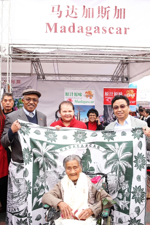 马达加斯加驻华公使(左一着帽)赠送马会长母亲(居中)一幅具有该国风情的桌布