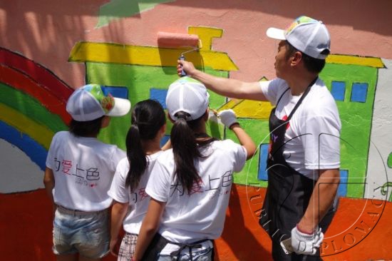 在中国,近6100万留守儿童的群体,他们的父母因为生活被迫远离,自此在需要父母守护与爱的年纪却孤独寂寞成长着,有时甚至过早地承担起本不该在童年时候承担的责任。在河南一个留守儿童集中的村庄,糖果计划(Project Candy)建设了吕庄儿童艺术中心,为当地400余名留守儿童提供艺术类教育课程,暑期开办艺术夏令营,用艺术陪伴留守儿童,为孩子创造快乐的时光。2014年,立邦与糖果计划合作,用立邦员工创作投稿的一副“筑梦”图案,为中心进行了修复与内外墙涂刷。2015年7月,立邦与糖果计划再度合作,启动了“为村庄上色”计划,希望能为吕庄村涂上美丽的颜色,改善吕庄村孩子们的居住环境,实现他们希望“父母多回家”的盼望,同时让他们在充满色彩的环境中快乐的成长,摆脱灰暗的童年。