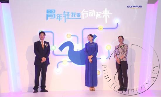 奥林巴斯(中国)有限公司品牌战略统括本部总经理大浦康达先生、首都医科大学附属北京同仁医院消化内科主任钱冬梅教授、著名歌手叶蓓共同点亮主题背板,宣告2015“爱胃月”正式启动 奥林巴斯(中国)有限公司品牌战略统括本部总经理大浦康达先生、首都医科大学附属北京同仁医院消化内科主任钱冬梅教授、著名歌手叶蓓共同点亮主题背板,宣告2015“爱胃月”正式启动