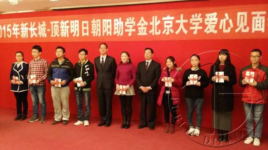 顶新公益基金会携手中国扶贫基金会“新长城-顶新明日朝阳助学金”受奖学生爱心见面会近日在北京大学举行。参加此次活动的有中国扶贫基金会副会长江绍高、顶新公益基金会理事长滕鸿年、北京大学党委副书记叶静漪、中国农业大学食品科学与营养工程学院副院长张虎、40名北大受奖学生、中国人民大学、北京交通大学、北京师范大学、北京林业大学等其他北京受奖学校师生代表以及社会各界爱心人士。