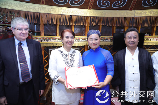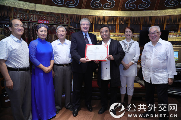 马振轩会长、曲真副会长分别向克劳德·拉罗公使和夫人玛丽亚·蓓阿德丽兹·蒂娜赫洛颁发证书并赠礼。克劳德·拉罗公使受聘担任公共外交网终身荣誉顾问,玛丽亚·蓓阿德丽兹·蒂娜赫洛夫人受聘担任公共外交网特约记者。